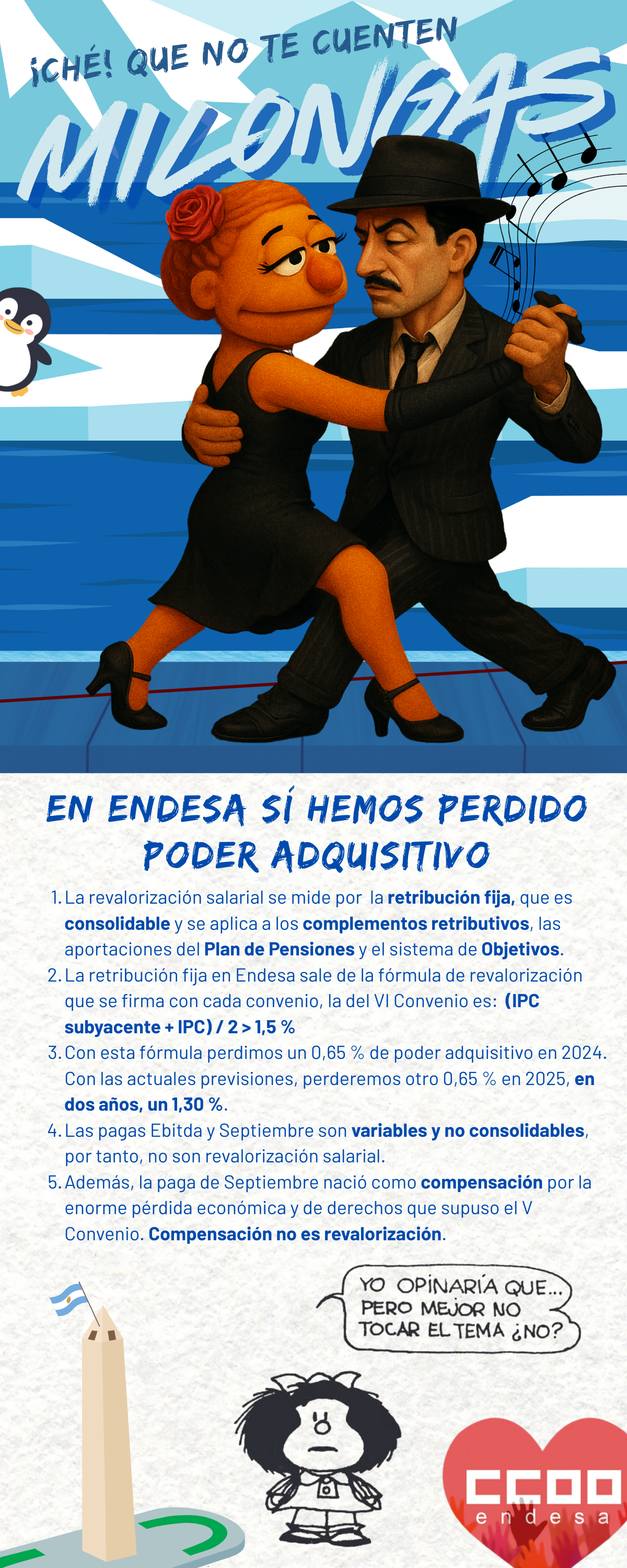 La dirección lo rechazó. Y, en cambio, mantuvo la fórmula existente para aquellos que en Endesa tenían un salario menor (IPC subyacente + IPC) / 2 > 1,5 %. Volvemos a instar a la dirección a que sustituya el 1,5 % por el 1 %, ya que, aunque ligeramente, mejoraría la fórmula a favor de la plantilla.