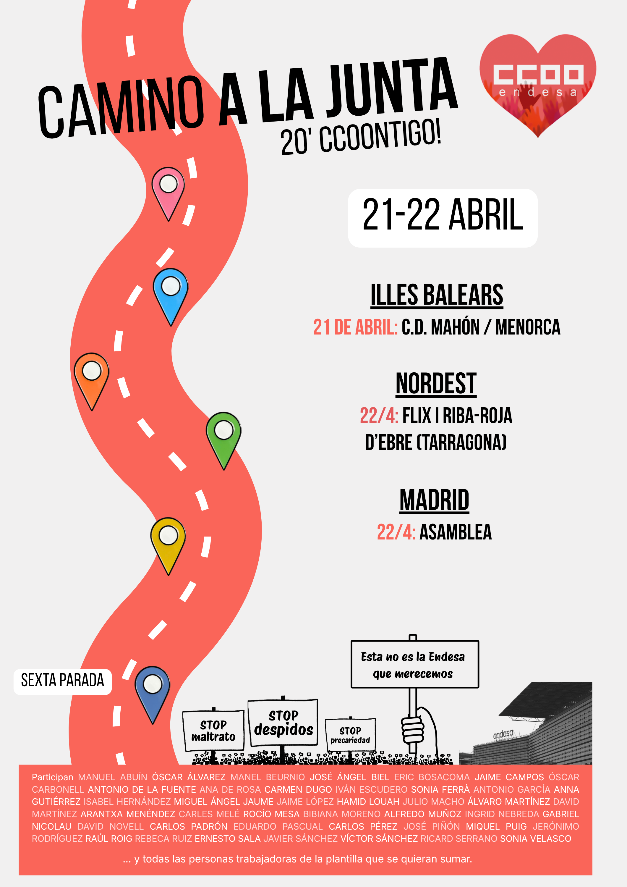 Desde el 11 de marzo estamos organizando, cada semana, en todos los centros de trabajo de Endesa encuentros informativos de 20 minutos con la plantilla. El objetivo es escuchar sus inquietudes y propuestas para construir, a partir de ellas, nuestra respuesta sindical en la Junta General de Accionistas de Endesa, que se celebrará en abril.