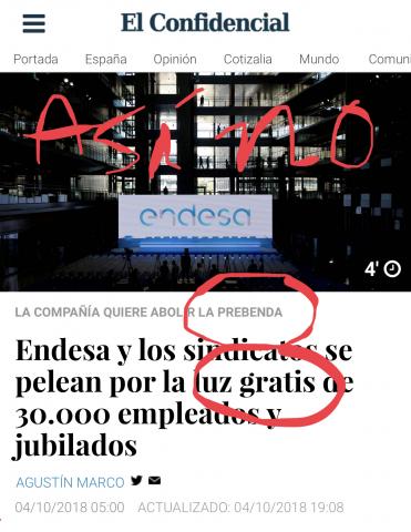Ante la desafortunada publicación de una noticia publicada ayer en el periódico digital “El Confidencial”, con el título “Endesa y los sindicatos se pelean por la luz gratis de 30.000 empleados y jubilados”, firmada por el periodista Agustín Marco, CCOO Endesa quiere manifestar a la plantilla lo siguiente: