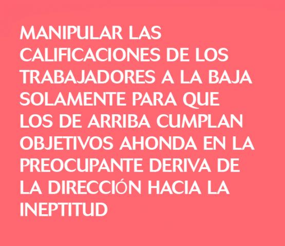 Manipular las calificaciones de los trabajadores a la baja solamente para que los de arriba cumplan objetivos ahonda en la preocupante deriva de la dirección hacia la ineptitud. Por si fuera poco, el clima laboral, que en Endesa es escandalosamente bajo, empeora. Como este proceso ya está cerrado, desde CCOO recomendamos a los trabajadores que no participen en otros de este tipo en el futuro mientras el sistema utilizado no ofrezca las garantías debidas.