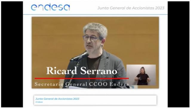 La intervención de CCOO Endesa en la Junta General Ordinaria de Endesa, celebrada en la sede de Endesa de Madrid el pasado 28 de abril, a cargo de Ricard Serrano, secretario general de CCOO Endesa, tuvo como eje principal la necesidad de mejorar las condiciones salariales y laborales tomando como base los beneficios extraordinarios que ha venido comunicando la empresa en los últimos años.