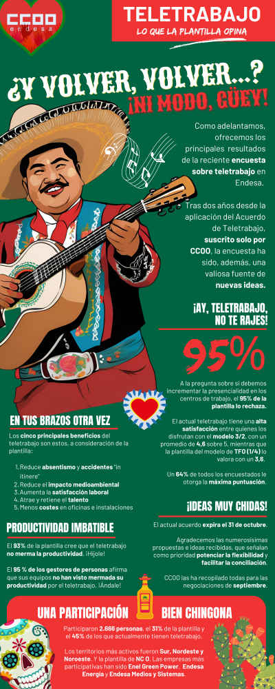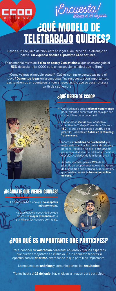 La dirección nos ha convocado a una reunión el próximo lunes, 16 de septiembre, para abordar la negociación del nuevo modelo de teletrabajo que tendremos en Endesa a partir del 31 de octubre. En esa fecha finaliza la vigencia del actual acuerdo, que firmó solamente la sección sindical de CCOO Endesa. Gracias al mismo, la plantilla ha podido teletrabajar durante algo más de dos años.